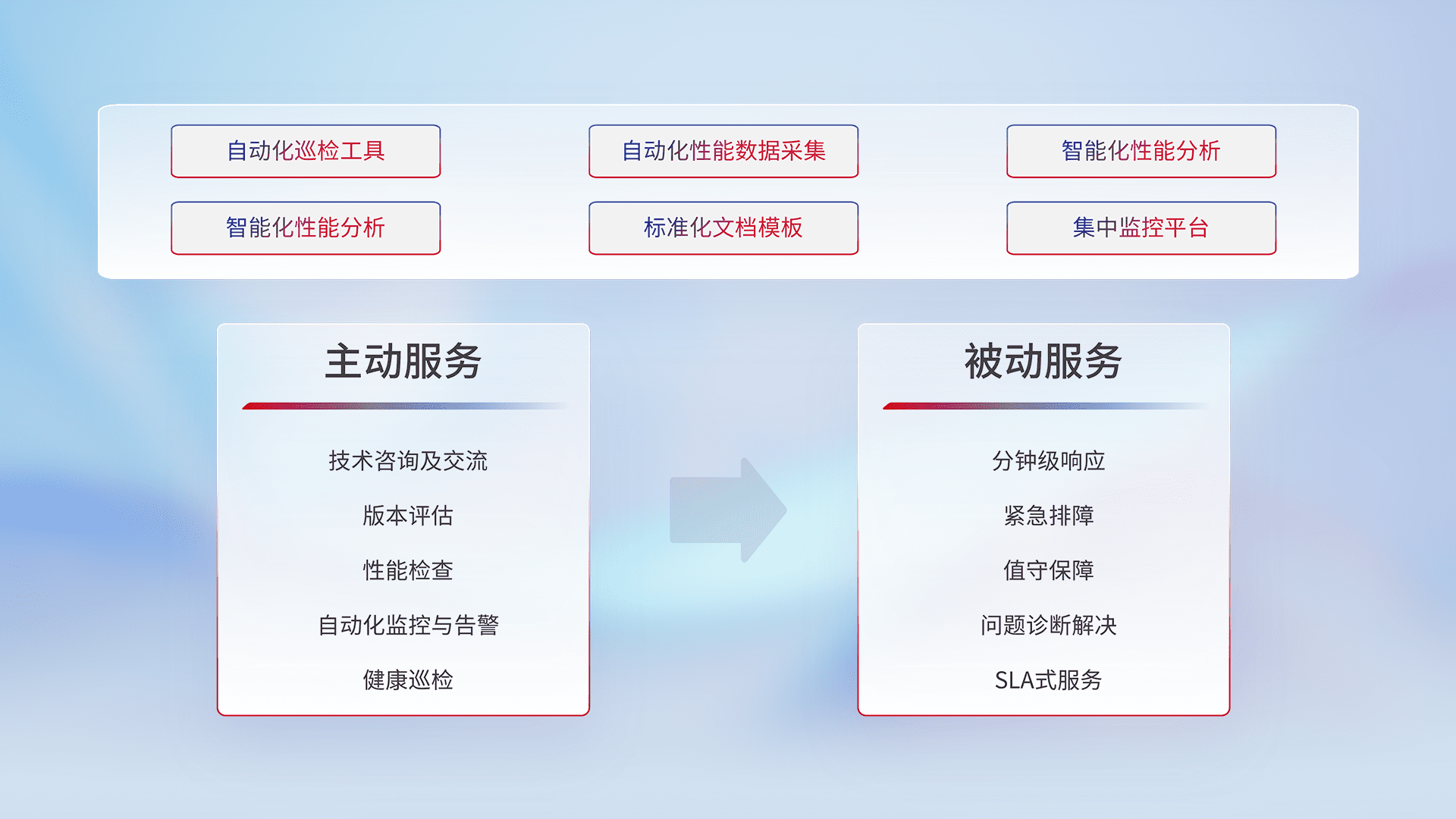 智能化工具和标准化文档,,,,保障服务质量,,,,提供主动服务(包含技术咨询、、版本评估、、、、性能检查、、、自动化监控与告警、、、健康巡检)和被动服务包含(分钟级响应、、、、紧急排障、、值守保障、、、问题诊断解决、、SLA服务)。。。。