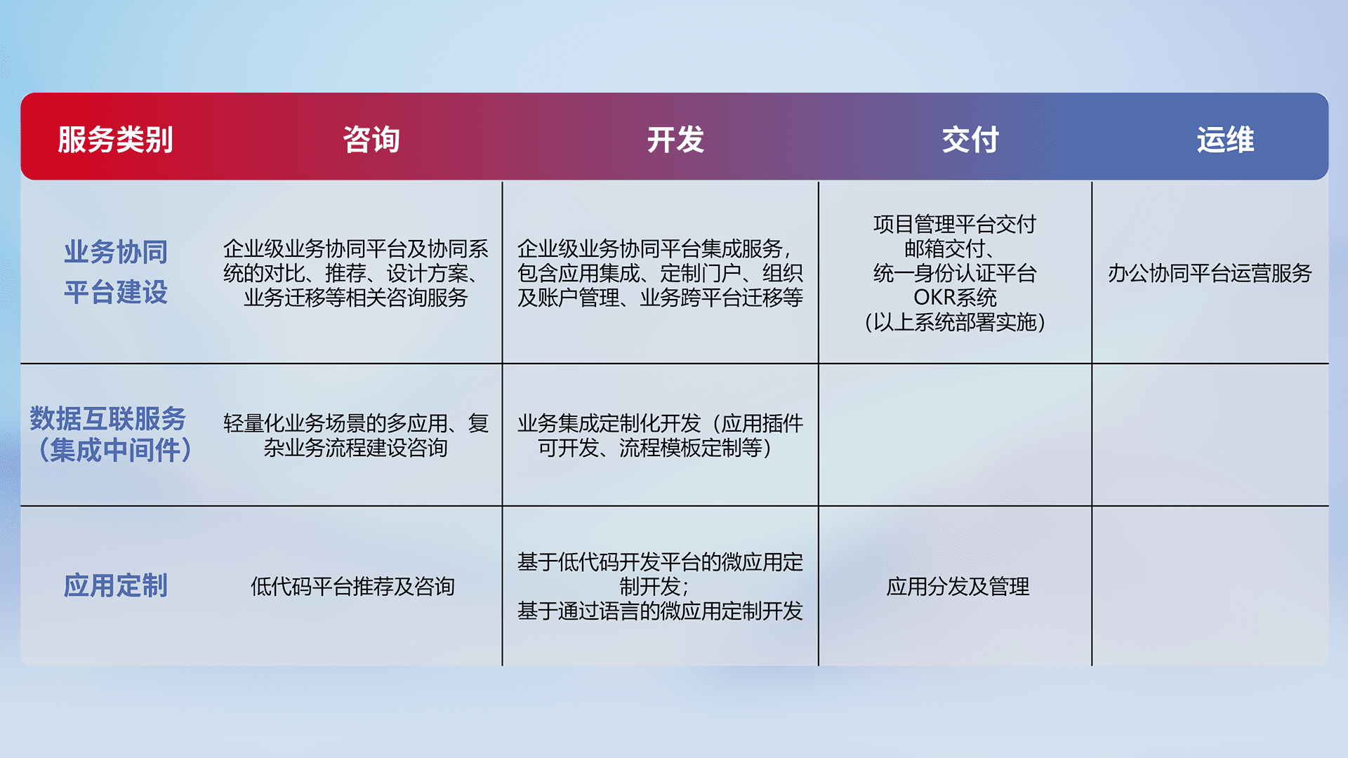 针对钉钉、、、、企微、、IDaas等平台级产品提供产品的规划、、方案、、交付、、、定制化开发等服务,,,实现如统一协同办公、、、智能客户服务、、、混合会议管理、、、、智能数据查询、、、等业务场景,,实现数字化转型。。。